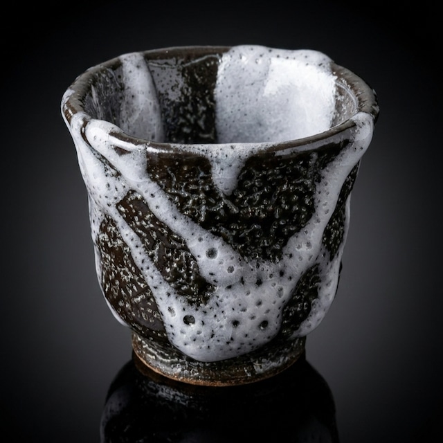 漆黒の地に、幾層にも重ねられた釉薬。 そのなかで、かすかな蒼が溶け込み、乳濁の釉薬が独特の景色を生み出しています。 表面に現れた虫喰いが、夜空の星のような表情をつくり出しています。 黒と白を基調にしたぐい呑みですが、 この作品を啓蔵はいたく気に入っておりました。 あるとき 「黒い地に乳濁の釉薬という作品はこれまでもあったが、何がそれほど違うのか」 と尋ねたことがあります。 啓蔵いわく、なによりも、この「虫喰い」が違うのだそうです。 黒の地釉、その上からかかる乳白色の釉薬。 その両方に「虫喰い」の孔(あな)が現れている。 それがどれほど難しいことか、と語ってくれました。 愛おしそうに、この作品をじっとみつめる啓蔵の姿から、思い通りの作品が生み出された喜びが伝わってきました。 そしてこうも言っていました。 「この違いがわかる人に、その良さをわかった上で使ってもらいたい。よくわからない人にはこの作品を手放したくない。」 (啓蔵虫食いに関するブログ記事) https://kei-zo.com/tag/1172/ (サイズ) ・直径 6.5cm ・高さ 5cm Guinomi by Keizo Hagihara (萩原啓蔵) Layers of deep black glaze form the ground. Within them, a faint blue emerges, while a milky overglaze creates a quiet, shifting landscape. Small mushikui pits appear across the surface, like stars in a night sky. Though simple in black and white, this was a piece Keizo was especially fond of. When I once asked what made it different from earlier works with a similar glaze, he answered without hesitation — the mushikui. Both the black base glaze and the milky overglaze reveal these tiny openings. Achieving this in both layers, he said, is remarkably difficult. Looking at the piece with quiet affection, he added: “I would like this to go to someone who can truly see it. Otherwise, I would rather keep it.”