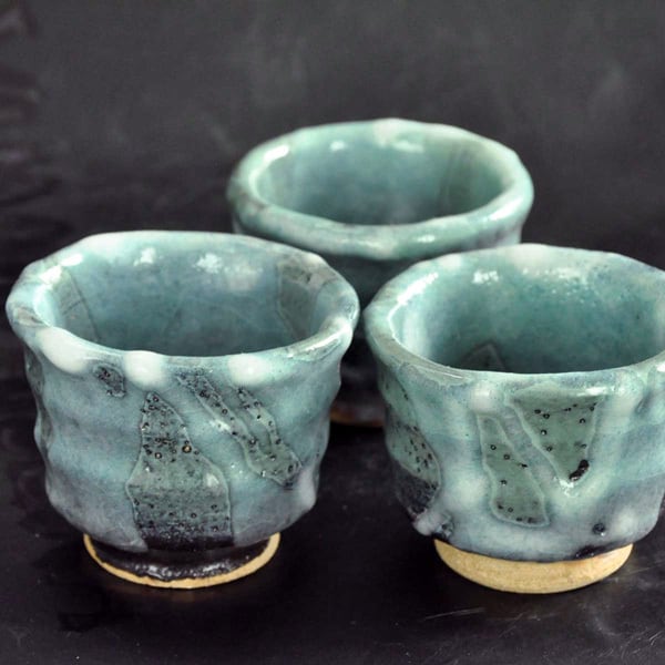 このぐい呑みも、やや青緑がかった淡い青と、青みを含んだ白い釉薬の組み合わせが美しい作品です。