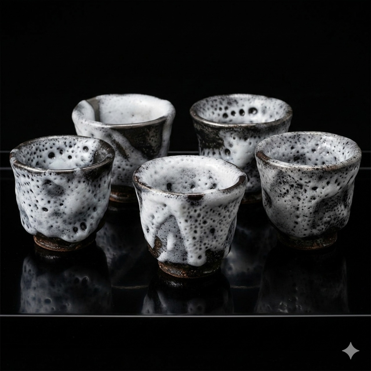このぐい呑みは、光沢のある黒い「焼きしめ」の表面に、淡い白の釉薬(ゆうやく)がかかっています。モノトーンで渋い色合いですが、力強いエネルギーを感じさせる不思議な魅力があります。